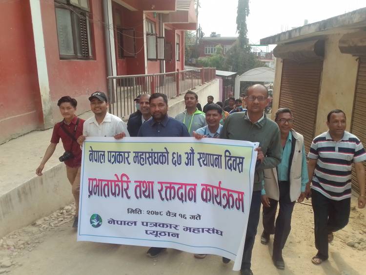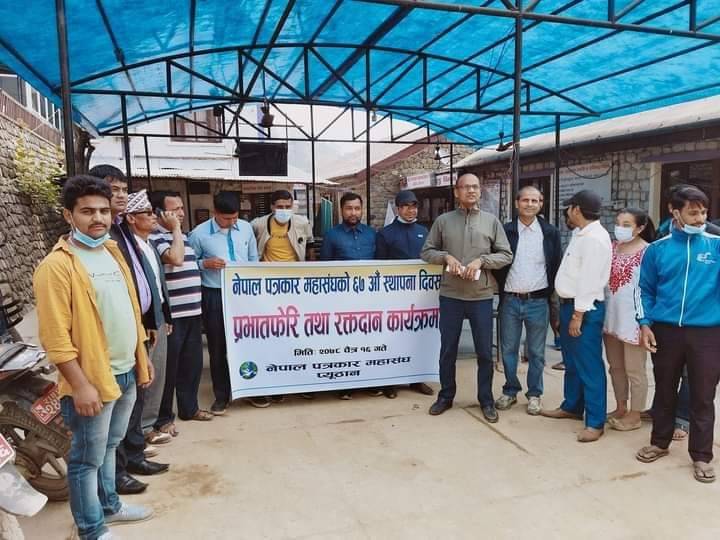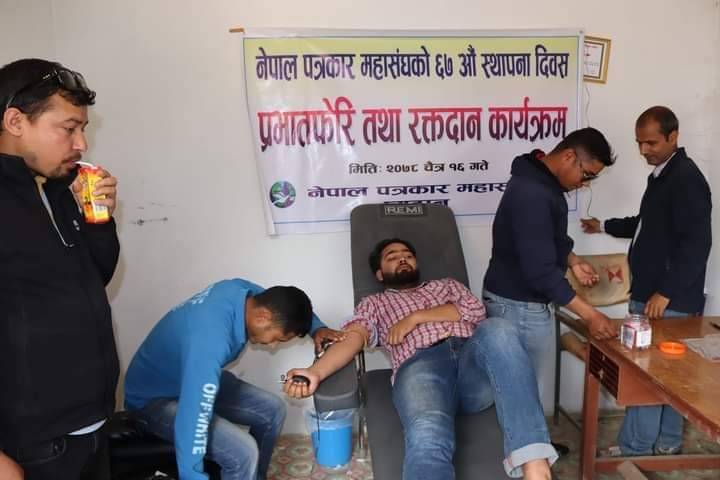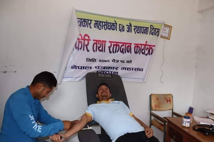 स्थापना दिवसको अवसरमा आयोजना गरिएको रक्तदान कार्यक्रममा ७ जना पत्रकारहरुले नेपाल रेडक्रस सोसाइटी जिल्ला शाखा प्यूठानद्धारा सञ्चालित रक्तसञ्चार केन्द्र बिजुवारमा रक्तदान गरेको शाखाका सचीव प्रकाश बैद्दले जानकारि दिए।
