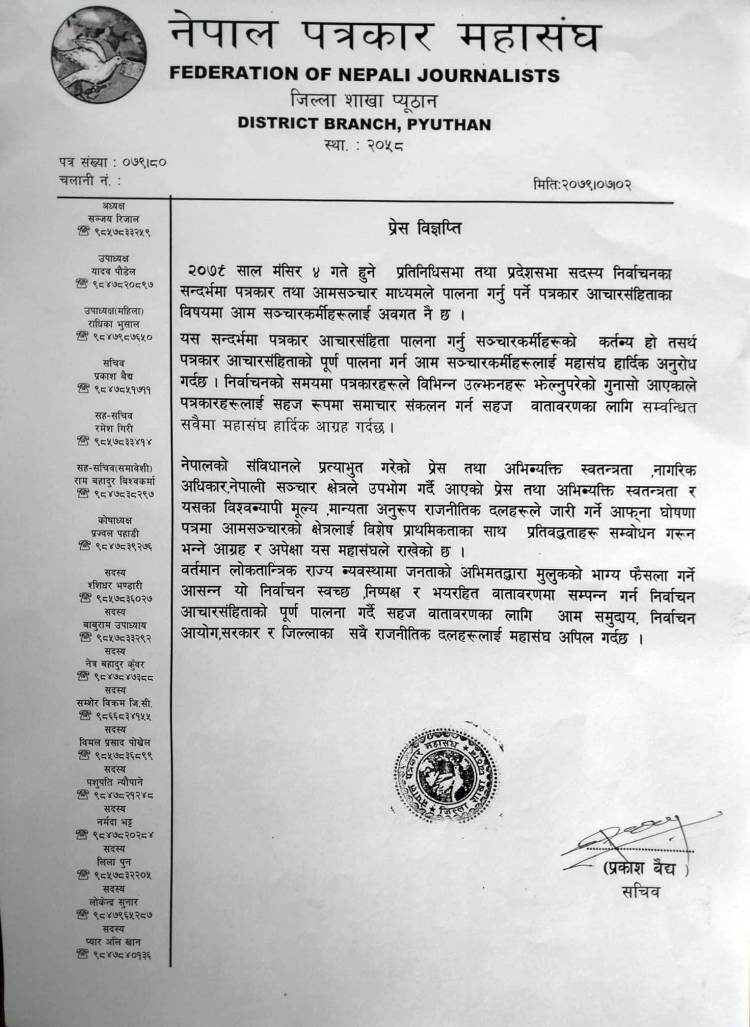तस्बिर: नेपाल पत्रकार महासंघ प्युठान शाखाका सचिब प्रकाश बैद्द द्वारा हस्ताक्षरित बिज्ञप्ति