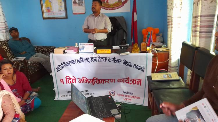 कार्यक्रम सहजीकरण गर्दै उद्यम बिकास सहजकर्ता शारदा बिश्वकर्माले गरिबी निवारणको लागि लघु उद्यम विकास (मेड्पा) कार्यक्रम अन्तर्गत लक्षित समूहको चाहना तथा माग, बजार सम्भावना तथा स्थानीय श्रोतको उपलब्धताको आधारमा उद्यमशिलताको विकास गरिने बताउनुभयो ।