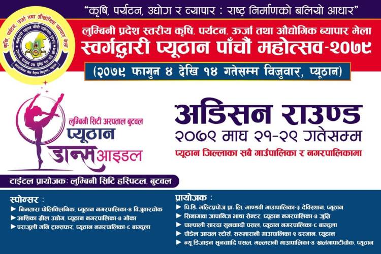 प्युठान,स्वर्गद्वारी प्यूठान पाँचौं महोत्सवको एक महत्त्वपूर्ण संस्करण प्यूठान डान्स आइडल कार्यक्रमले नृत्य प्रतिभाको खोजी गर्दै अघि बढेको छ।