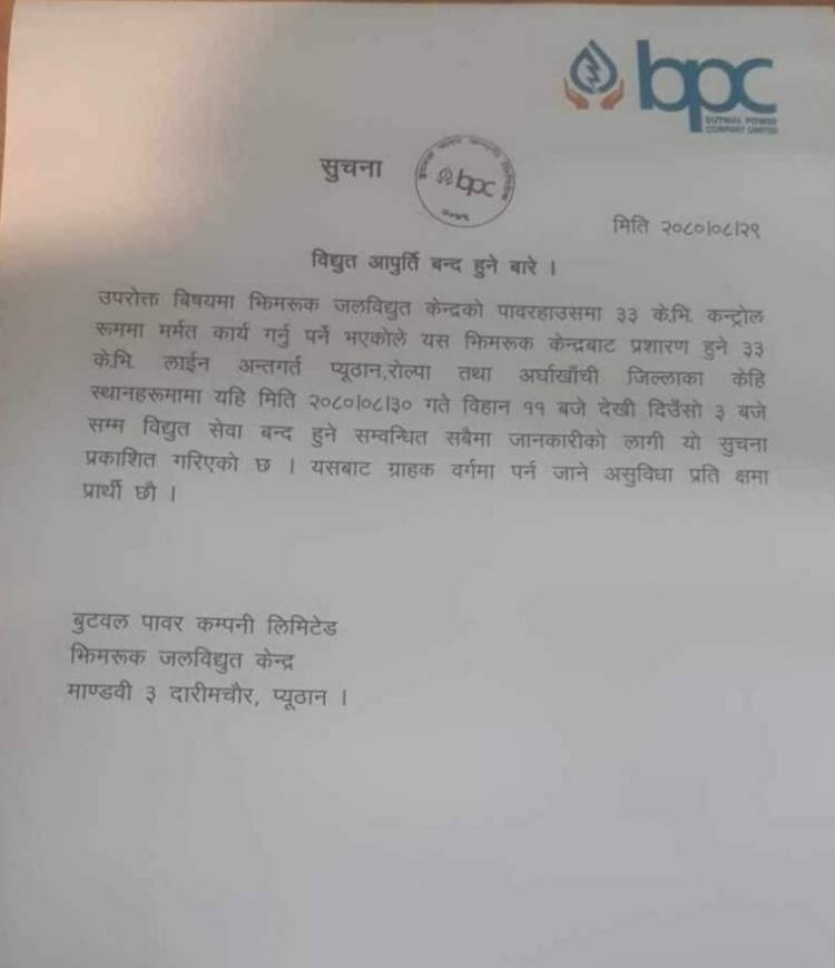 प्यूठान,प्यूठानमा भोली बिद्युत आपुर्ती बन्द हुने भएको छ । बुटवल पावर कम्पनी लिमिटेड भिमरुक जलबिद्युत आयोजनाले आज एक सुचना जारीगर्दै झिमरुक जलबिद्युत केन्द्रको पावरहाउसमा मर्मत गर्नुपर्ने भएकाले बिद्युत आपुर्ती बन्दहुने जनाएको हो।३३ के.भि कन्टोलरुममा मर्मतको काम हुने भएकाले प्यूठान सहित, रोल्पा, अर्घाखाचीका केहि क्षेत्रमा बिद्युत आपुर्ती बन्दहुने जनाएको छ । बिहान ११ बजेदेखी दिउसो ३ बजेसम्म बिद्युत सेवा बन्दहुने आयोजनाले जनाएको छ ।