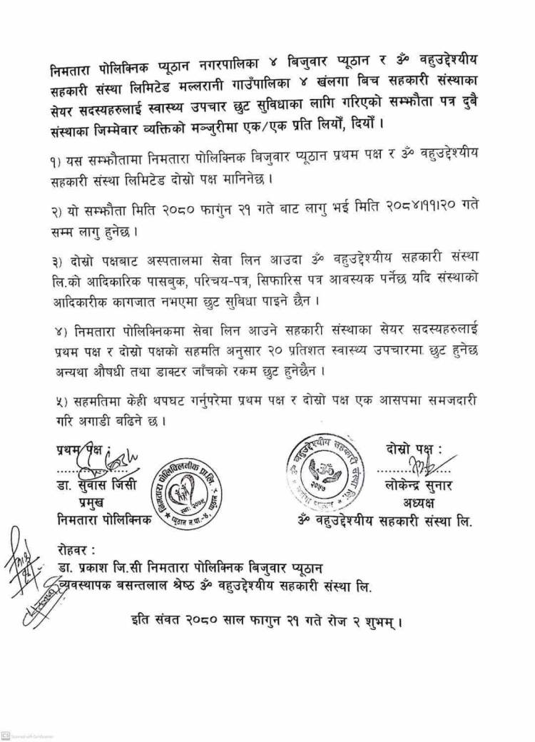 सहकारी र निमतारा पोलिक्लिनिक बिजुवार बीच सहकारीका सदस्यलाई उपचारमा छुट दिने सहमती भएको छ।सहमति अनुसार सेयर सदस्यले अबदेखि स्वास्थ्य उपचारमा २० प्रतिशत छुट पाउने भएका हुन् ।