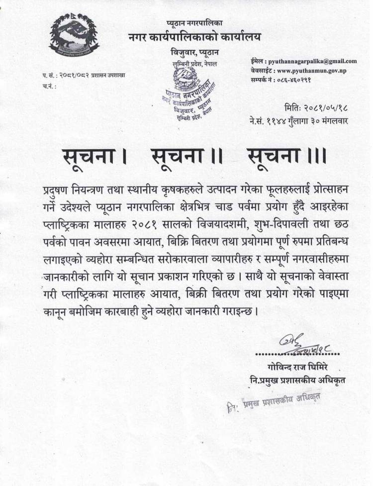 प्यूठान नगरपालिका मार्फत प्रदुषण नियन्त्रण तथा स्थानीय कृषकहरुले उत्पादन गरेका फूलहरुलाई प्रोत्साहन गर्ने उदेश्यले प्युठान नगरपालिका भित्र प्लाष्ट्रिकका मालालाई प्रतिबन्ध गरिएको सूचना