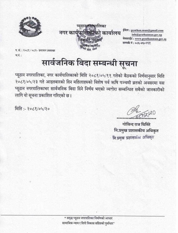 प्युठान,प्युठान नगरपालिकाले आइतबार सार्वजनिक बिदा दिने निर्णय गरेको छ। भाद्र ११ गते बसेको नगर कार्यपालिका बैठकले २०८१/०५/२३ गते आइतबारको दिन महिलाहरुको विशेष पर्व ऋषि पञ्चमी व्रतको अवसरमा नगरपालिकाभर सार्वजनिक बिदा दिने निर्णय भएको नगरपालिकाका निमित्त प्रमुख प्रशासकीय अधिकृत गोबिन्द घिमिरेले जानकारी दिनुभयो।