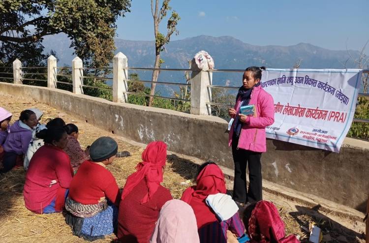 तस्बिर :सहभागितात्मक ग्रामिण लेखाजोखा(पि.आर.ए) कार्यक्रममा सहजीकरण गर्नुहुदै उद्यम बिकास सहजकर्ता - सीता बि.क