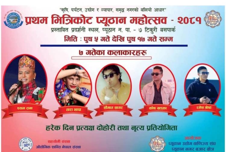 प्यूठान,प्रथम भित्रिकोट प्यूठान महोत्सवमा आज चर्चित गायक श्याम रानाको प्रस्तुति रहने आयोजकले जनाएको छ । महोत्सवको तेस्रो दिन आईतवार लोकदोहोरी गायक श्याम राना आउने तय भएको छ ।राना लाईभ दोहोरीबाट चर्चामा आउनुभएको हो )।ठट्यौली पाराको गीत गाउने रानाको फ्यानफलो धेरै छ ।त्यसैगरी आधुनिक गीत संगीतका चर्चित गायक सौगात सायरको पनि प्रस्तुति रहनेछ । तिमी फुल्यौ कतै म फुले कतै सायरको लोकप्रिय गीत हो ।