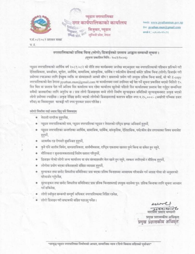 प्रतिक चिन्ह (लोगो) डिजाईन गरी प्रयोगमा ल्याउनका लागि ईच्छुक व्यक्ति वा संस्थाहरूले आफ्नो सीप र क्षमताको प्रयोग गरी उपयुक्त प्रतिक चिन्ह बनाई सो को E-copy नगरपालिकाको मेल ठेगाना pyuthan.mun@gmail.com वा कार्यालयमा स्वयं उपस्थित भई प्रस्ताब पेश गर्नुपर्ने बताउनुभयो।