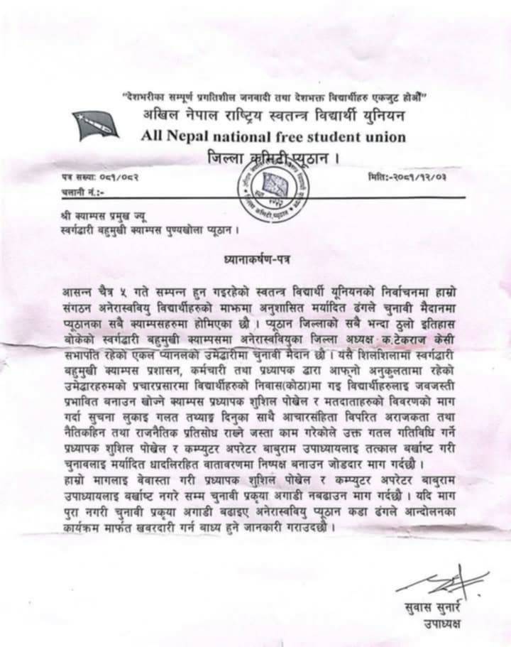 अनेरास्ववियुका जिल्ला उपाध्यक्ष सुवास सुनारले हाम्रो मागलाइ वेवास्ता गरी प्रध्यापक शुशिल पोखेल र कम्प्युटर अपरेटर बाबुराम उपाध्यायलाइ बर्खास्त नगरे सम्म चुनावी प्रकृया अगाडी नबढाउन माग गर्दछौ उनले भने।यदि क्याम्पस प्रशासनले माग पुरा नगरी चुनावी प्रकृया अगाडी बढाइए अनेरास्ववियु प्यूठान कडा ढंगले आन्दोलनका कार्यक्रम मार्फत खवरदारी गर्न बाध्य हुने जानकारी गराउदछौ।