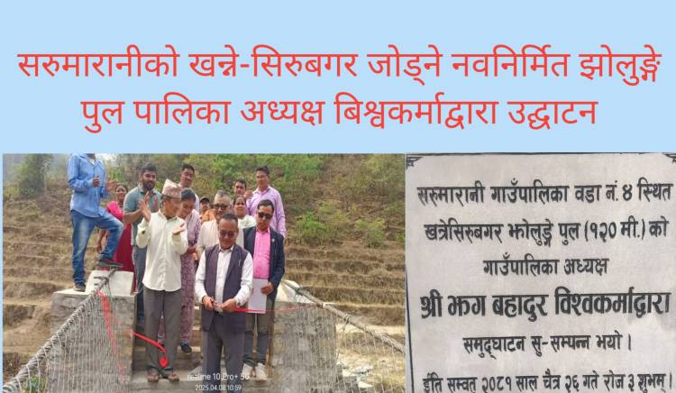 विसं २०८० मंसिर २६ गते सम्झौता गरि निर्माण कार्य शुरु गरी २०८१ फागुन १९ फागुन १९ गते सम्पन्न भएको खत्रेसिरु बगर झोलुङ्गे पुल पुल निर्माण भएको सरुमारानी गाउँपालिका वडा नम्बर ४ का वडा अध्यक्ष तथा गाउँपालिका प्रवक्ता चिन्त सोमै मगरले बताउनुभयो। पुल निर्माण भएपछि स्थानीयबासीलाई सहज भएको बताउनुभयो।निर्माण समितिका अध्यक्ष खगेश्वर रेश्मी मगरकाे अध्यक्षता,गाउँपालिका प्रवक्ता तथा ४ नं.वडा अध्यक्ष चिन्त साेमै मगरकाे स्वागत मन्तब्य र वडा सदस्य भाेज बहादुर सारू मगरकाे संचालनमा भएको उक्त कार्यक्रममा गाउँपालिकाका अध्यक्ष झग बहादुर विश्वकर्माकाे प्रमुख आतिथ्यता,उपाध्यक्ष बसन्त खडका,मल्लरानी ग्रामीण विकास सराेकार केन्द्र प्युठानका कार्यकारी प्रमुख बिजय श्रेष्ठ,TID/PTA वुटवलका प्राविधिक अधिकृत श्रीधर भण्डारी,कार्यपालिका सदस्य कल्पना विश्वकर्मा,वडा सदस्यहरू,MRDCC का ईन्जिनियर लगाएत कर्मचारीहरू,टाेल विकास संस्थाका अध्यक्ष मतिराम सारु,लाभान्वित उपभोक्ताहरूकाे उपस्थिति रहेको थियो।