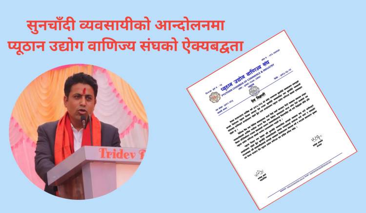 नेपाल सरकारद्वारा आर्थिक वर्ष २०८२/०८३ को बजेट भाषणमा सुनचाँदी व्यवसायमा लगाएको करको बिरोधमा प्यूठान जिल्ला लगाएत देश भरका सुनचाँदी व्यवसायीहरु तथा सुनचाँदी व्यवसायी संगठनहरु शान्तिपूर्ण आन्दोलनमा रहेको हुँदा उक्त आन्दोलनमा प्यूठान उद्योग वाणिज्य संघको एक्यबद्वता रहेको छ।विभिन्न बैंक तथा वित्तिय संस्थाहरुबाट कर्जा लिई चर्को व्याजदर तिरी व्यवसाय संचालन गरेका व्यवसायीहरुको आर्थिक मन्दीका कारण बैंक तथा वित्तिय संस्थाहरुको व्याज समेत तिर्न नसकेको यस विषम परिस्थितिमा राजश्व संकलनको नाममा व्यवसायीहरुलाई निरुत्साहित गर्ने गरी लिईएको नीति प्रति प्यूठान उद्योग वाणिज्य संघको गम्भीर ध्यानाकर्षण भएको छ।प्यूठान जिल्ला तथा देशका सबै सुनचाँदी व्यवसायीहरु आफ्नो व्यवसाय बन्द गरी शान्तिपूर्ण आन्दोलनमा रहेको हुँदा सुनचाँदी व्यवसायीहरुको जायज मागहरुलाई सम्बोधन गरी वार्ता र संवादको माध्यमबाट सवै व्यवसायीहरुलाई आफ्नो व्यवसाय निर्वाधरुपमा संचालन गर्ने र गराउने वातावरण सृजना गर्न नेपाल सरकार सँग प्यूठान उद्योग वाणिज्य संघ हार्दिक अपिल गर्दछ ।