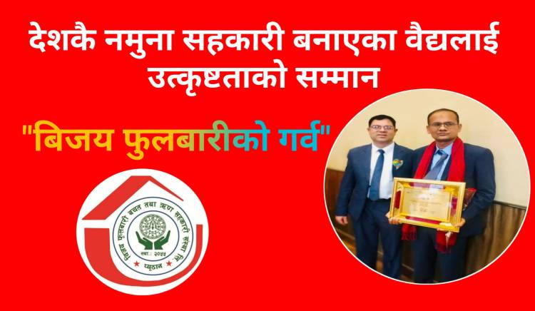 राष्ट्रिय तथा अन्तर्राष्ट्रिय बचत तथा ऋण सहकारी अभियानमा उच्च योगदान पुऱ्याए बापत नेपाल बचत तथा ऋण केन्द्रिय सहकारी संघ लि. (नेफ्स्कुन) को गत शनिबार सम्पन्न ३८औं स्थापना दिवसको अवसरमा ब्यबस्थापक वैद्यलाई नेफ्स्कुनले लुम्बिनी प्रदेशबाट उत्कृष्ट ब्यबस्थापकको रुपमा नगद सहित प्रमाणपत्र र दोसल्ला ओढाएर सम्मान गरेको हो।