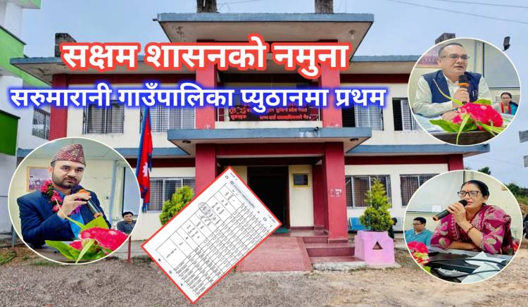 संघीय मामिला तथा सामान्य प्रशासन मन्त्रालयले आर्थिक वर्ष २०८१/८२ को सार्वजनिक गरेको अन्तिम नतिजा अनुसार सरुमरानी गाउँपालिका जिल्लामै प्रथम भएको हो।जिल्लामा २ नगरपालिका र ७ गाउँपालिका रहेका छन।सरुमारानी गाउँपालिकाले यसपटक शासकीय प्रवन्धमा ८.५०, संगठन तथा प्रशासनमा ८, वार्षिक बजेट तथा योजना तर्जुमा व्यवस्थापनमा ९,वित्तीय व्यवस्थापनमा १०.५०,सेवा प्रवाहमा १३.५०,न्यायिक कार्यसम्पादनमा ७,भौतिक पूर्वाधारमा १०.५०,सामाजिक समावेशीकरणमा ८, वातावरण संरक्षण तथा विपद् व्यवस्थापनमा ६.५० र सहकार्य तथा समन्वयमा ५.५० अंक हासिल गरेको गाउँपालिका अध्यक्ष झग बहादुर बिश्वकर्माले जानकारी दिए।