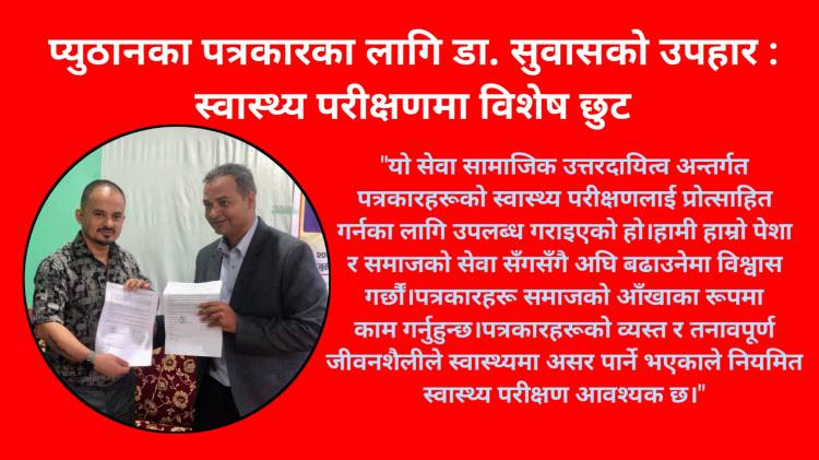 निमतारा पोलिक्लिनिकका चर्चित स्वास्थ्य व्यवसायी डा. सुवास जि.सि ले पत्रकार महासंघ प्यूठान शाखाको २४औं स्थापना दिवसको अवसरमा जिल्लाका क्रियाशील पत्रकारलाई स्वास्थ्य परीक्षणमा विशेष छुट सुविधा प्रदान गरिने घोषणा गर्नुभएको हो।