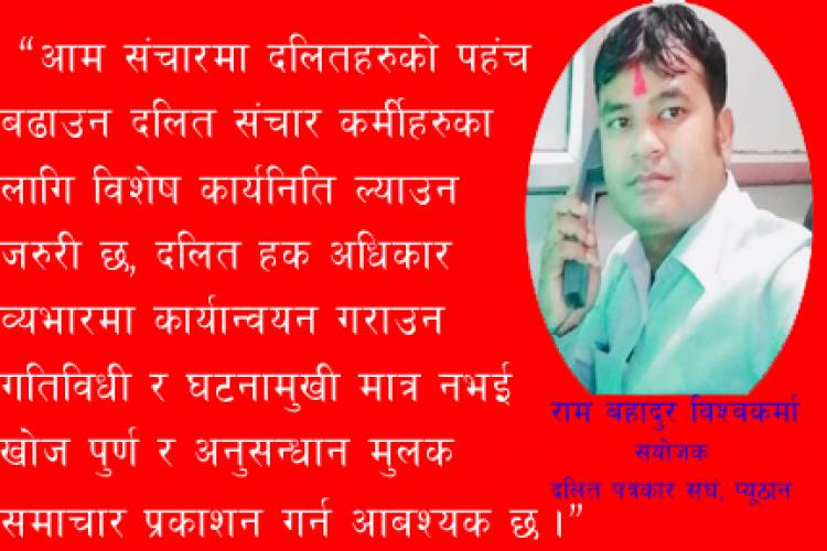 दलित समस्यालाई घटनाका रुपमा हैन अब सवालका रुपमा शसक्त ढंगले मिडियाले उठान गर्नुपर्ने भएकाले दलित जातिका इतिहास,धर्म,संस्कृति, भाषा,चाडपर्व,भेषभुषा र जीवन भोगाई आदिलाई पनि विश्वसामु परिचित गराउन एउटा संगठित पत्रकारिताको माध्यमबाट सहज हुने भएकोले दलित पत्रकार संघ नै जन्म हुनुपर्दछ । दलित जातिको जातीय भाषिक, सांस्कृतिक, राजनीतिक, आर्थिक लगायतका विषयमा राष्ट्रिय अन्तर्राष्ट्रिय स्तरमा प्रचारप्रसार गराउने सञ्चार माध्यममा कार्यरत दलितहरुलाई संगठित गरेर उनीहरुको हकहित र अधिकार संरक्षण तथा व्यवसायिक क्षमता अभिबृद्धि गर्ने,दलित जातिको सर्वाङगीण बिकासका लागि आमसञ्चार माध्यमको संस्थागत बिकास गर्न ध्यान जानुपर्दछ। झण्डै २ दशक लामो इतिहास बोकेको पत्रकार महासङघलाई सबै पत्रकारले साझा भनेर स्वीकार गरेको भए पनि मूलतःअहिले पनि दलित पत्रकारहरुको पहुँच भन्दा बाहिर छ । पत्रकार महासंघको निर्वाचनलाई हेर्ने हो भने पनि दलित पत्रकारका लागि छुट्याइएको सदस्यमा बाहेक अन्यमा दलित जातिको अनुहार देखिन्न ।