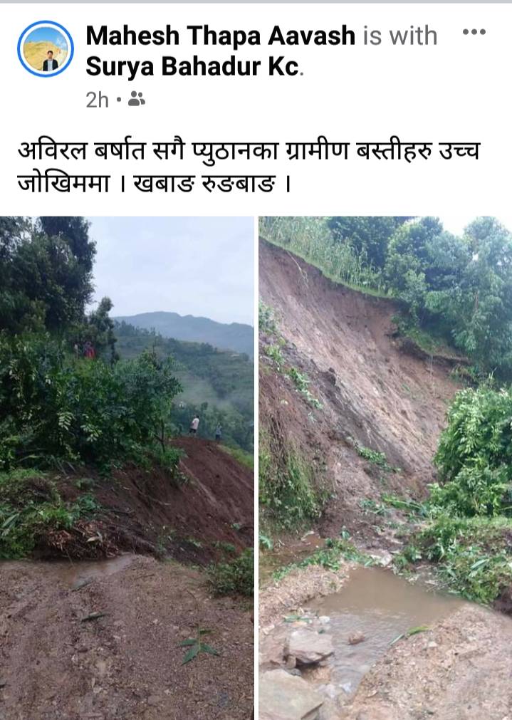 प्युठान,असार महिनामा सडकमा गरिएको लगानीको पूर्णरूपमा मूल्यांकन गर्ने बेला पनि आउँदो रहेछ। विगतका वर्षझैँ यो वर्ष पनि सडकमा गरिएको लगानी खेर जाने अवस्था देखिएको छ। प्रायः सबै स्थानका सडकमा यस्तै समस्या छ। कतिपय नाली विस्तार गरेरै खनिएका सडकहरूमा पनि यस्तो समस्या बढेको गुनासो छ।