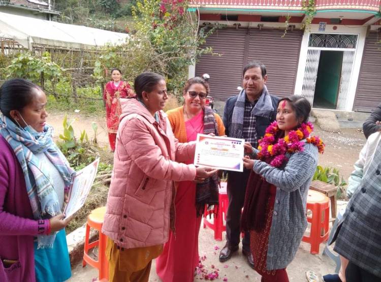 तस्बिर: तालिम सहभागीलाई प्रमाणपत्र प्रदान गर्दै प्युठान नगर उपप्रमुख शान्ता आचार्य