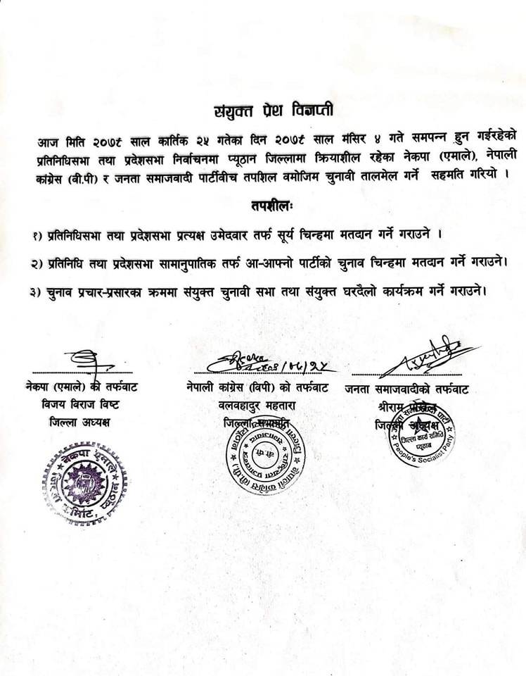 शुक्रबार नेकपा एमालेका जिल्ला अध्यक्ष विजय राज विष्ट,कांग्रेस वीपीका जिल्ला सभापति बलबहादुर महतारा र जनता समाजवादीका जिल्ला अध्यक्ष श्रीराम पोखरेलले संयुक्त विज्ञप्ति जारी गर्दै चुनावी तालमेल गर्ने ३ बुँदे सहमती गरेका हुन् ।