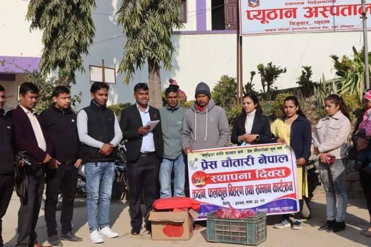 प्युठान, प्रेस चौतारी नेपाल जिल्ला शाखा प्युठानले २५ औ स्थापना दिवसको अवसरमा प्युठान अस्पतालका विरामीलाई फलफूल वितरण गरेको छ।प्रेस चौतारी नेपालको २५ औँ स्थापना दिवसको अवसरमा जिल्ला शाखा प्युठानले अस्पतालमा उपचारत विरामीलाई रक्तदान, फलफूल वितरण तथा पत्रकार लाई सम्मान गरि स्थापना दिवस मनाएको हो।
