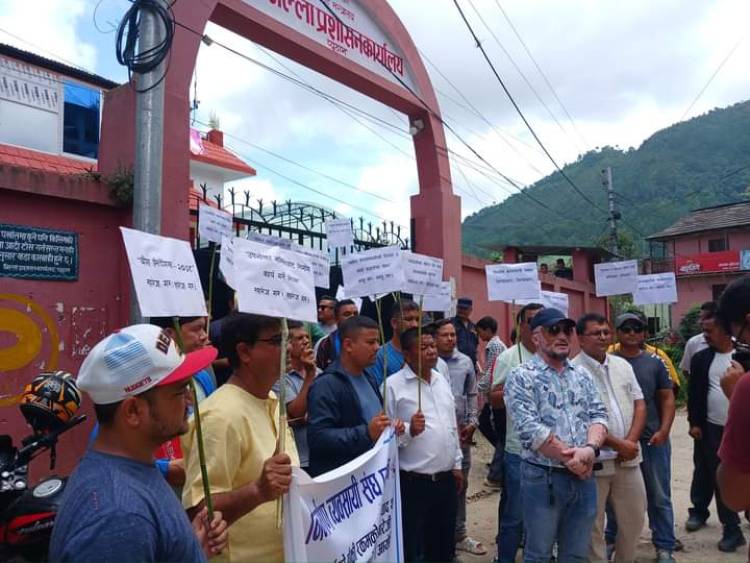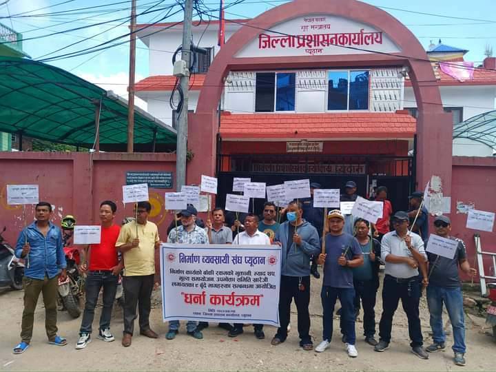 प्युठान,निर्माण ब्यबसायी संघ प्युठानले आइतबार जिल्ला प्रशासन कार्यालयमा धर्ना दिएको छ ।