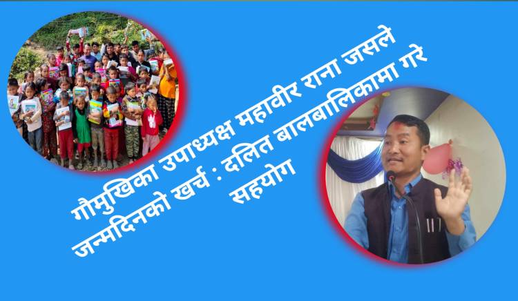 तस्बिर :दलित समुदायका बालबालिकाको पठनपाठनमा सहजता होस् भन्ने उद्देश्यले आफ्नो जन्मदिनको अबसरमा स्टेसनरी प्रदान गर्दै गौमुखी गाउँपालिकाका उपाध्यक्ष महाबिर राना