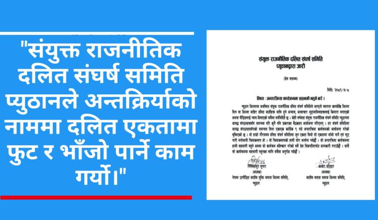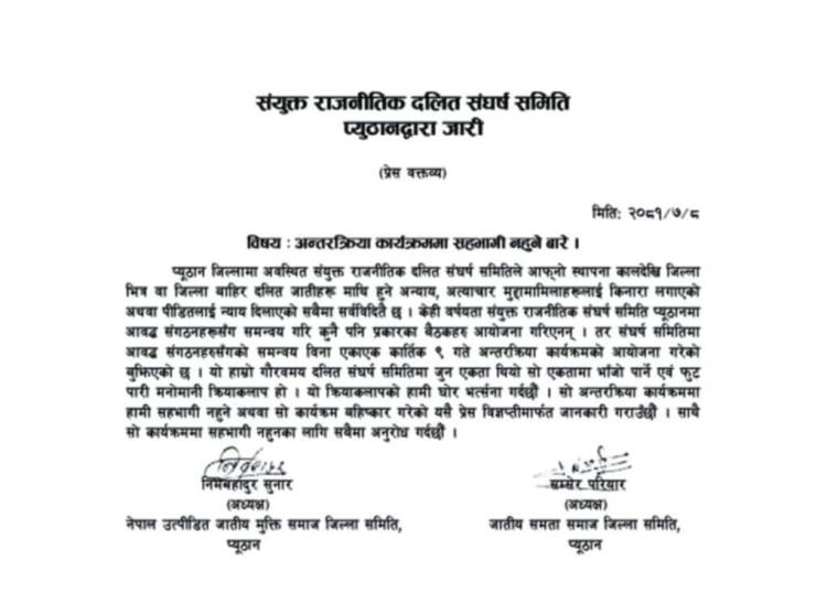 प्यूठान जिल्लामा अवस्थित संयुक्त राजनीतिक दलित संघर्ष समितिले आफ्नो स्थापना कालदेखि जिल्ला भित्र वा जिल्ला बाहिर दलित जातीहरू माथि हुने अन्याय,अत्याचार मुद्दा मामिलालाई किनारा लगाएको अथवा पीडितलाई न्याय दिलाएको सबैमा सर्वविदितै छ।केही वर्षयता संयुक्त राजनीतिक संघर्ष समिति प्यूठानमा आवद्ध संगठनहरूसँग समन्वय गरि कुनै पनि प्रकारका बैठकहरु आयोजना गरिएनन्।तर संघर्ष समितिमा आवद्ध संगठनहरुसँगको समन्वय विना एकाएक कार्तिक ९ गते अन्तरक्रिया कार्यक्रमको आयोजना गरेको बुझिएको छ।यो हाम्रो गौरवमय दलित संघर्ष समितिमा जुन एकता थियो सो एकतामा भाँजो पार्ने एवं फुट पारी मनोमानी क्रियाकलाप हो।यो क्रियाकलापको हामी घोर भत्र्सना गर्दछौ विज्ञप्तीमा उल्लेख गरिएको छ।सो अन्तरक्रिया कार्यक्रममा आफ्नो सङगठन निगट साथिहरु सहभागी नहुने अथवा सो कार्यक्रम बहिष्कार गरेको र जिल्ला स्थित सम्पुर्ण दलित समुदायका सम्पुर्ण साथिहरुलाई कार्यक्रममा सहभागी नहुनका लागि प्रेस विज्ञप्ती मार्फत अपिल गरेका छन्।
