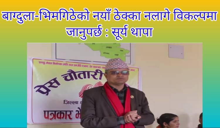 प्यूठान,प्रतिनिधिसभा सदस्य सूर्य थापाले बाग्दुला-भिमगिठे सडकको नयाँ ठेक्का नलागे त्यसको विकल्पमा जानुपर्ने बताउनुभएको छ । १२ वर्षदेखि अन्यौलमा रहेको आयोजनाको काम अघि बढाउनका लागि भारतबाट कुनै पनि प्रतिक्रिया नआएको भन्दै उक्त क्षेत्रमा बैकल्पिक योजनाहरुको विषयमा सोच्नुपर्ने बताउनुभएको हो ।