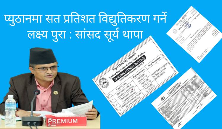 केही महिना अघि प्रतिनिधिसभाका सदस्य सुर्य थापाले प्यूठानका ६४ वटा वडा मध्य नौबहिनी १ स्याउलिवाङ्ग र गौमुखी गाउँपालिको रजवारामा बिद्युत केन्द्रीय प्रशारण लाईन छिटोछरितो बिस्तार गरि जिल्लालाई सत प्रतिशत बिद्युत बिस्तार घोषणा गर्न र ग्रामीण जनतामाझ विद्युत सेवा पुर्याउनमा महत्वपूर्ण भूमिका खेल्दै सम्बन्धित निकायलाई आग्रह गर्नुभएको थियो।