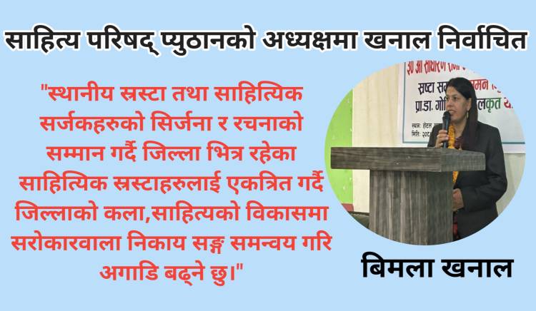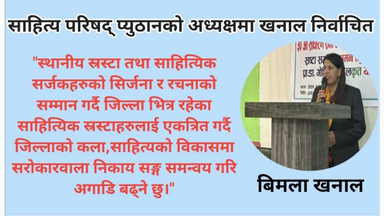 प्युठान,साहित्य परिषद् जिल्ला शाखा प्युठानको अध्यक्षमा साहित्यकार बिमला खनाल निर्बिरोध निर्वाचित हुनुभएको छ।