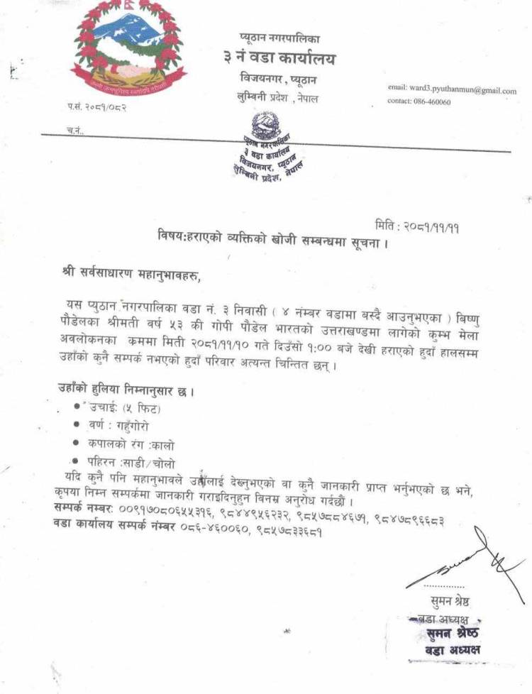 श्रेष्ठले प्युठान नगरपालिका वडा नं. ३ निवासी ४ नंम्बर वडामा बस्दै आउनुभएका बिष्णु पौडेलका श्रीमति वर्ष ५३ की गोपी पौडेल भारतको उत्तराखण्डमा लागेको कुम्भ मेला अवलोकनका क्रममा मिती२०८१ फागुन १० गते दिउँसो १:०० बजे देखी हराएको हुदाँ हालसम्म उनको कुनै सम्पर्क नआएकाले परिवार अत्यन्त चिन्तित भएको भन्दै सुचना जारी गर्दै खोजिका लागि आवश्यक प्रयास गरिदिन सर्बसाधरण लाई आग्रह गरेका हुन।