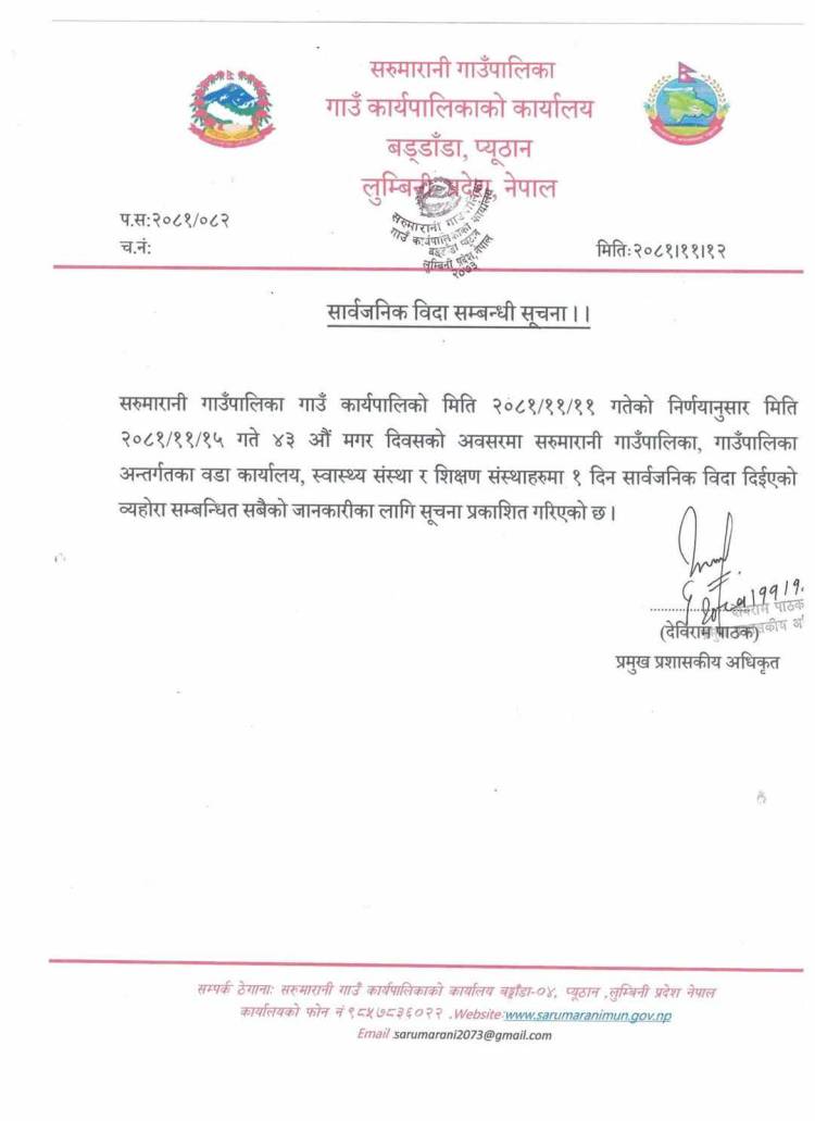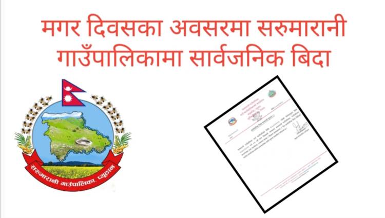 प्युठान,सरुमारानी गाउँपालिकाले मगर दिवसका अवसरमा सार्वजनिक बिदा दिने निर्णय गरेको छ।फागुन १५ गते ४३ औं मगर दिवसको दिन गाउँपालिका अन्तर्गतका कार्यालय,वडा कार्यालय,सार्वजनिक निकाय,सङ्घसंस्था,शिक्षण संस्था बन्द रहने जनाइएको छ।