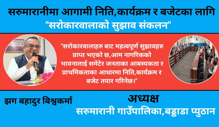 प्युठान,आर्थिक वर्ष २०८२/०८३ को नीति तथा कार्यक्रम र बजेटमा समेटिनुपर्ने विषयहरुमा सुझाव संकलनका लागि सरुमारानी गाउँपालिकाले सरोकारवालाहरुको रचनात्मक सुझाव संकलन कार्यक्रम आज सम्पन्न गरेको छ।