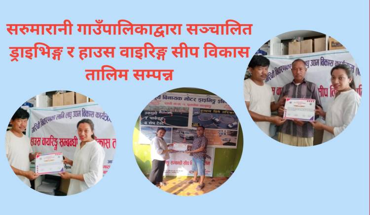 गरिबी निवारणका लागि लघु उद्यम विकास कार्यक्रम(मेड्पा)अन्तर्गत सरुमानी गाउँपालिकाले सञ्चालन गरेको एक महिने ड्राइभिङ तथा हाउस वारिङ्ग सम्बन्धि सीप बिकास तालिम आइतबार छुट्टाछुट्टै समापन गर्दै सहभागीहरुलाई प्रमाणपत्र हस्तान्तरण गरिएको हो।