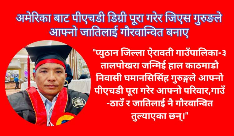 प्युठान,सामाजिक तथा राजनीतिक क्षेत्रमा उदाएका प्युठानीका छोरा घमानसिह गुरुङले सफलतापूर्वक आफ्नो पीएचडी पूरा गरेका छन्।प्युठान जिल्ला ऐरावती गाउँपालिका-३ तालपोखरा जन्मिई हाल काठमाडौ निवासी घमानसिह गुरुङ्गले आफ्नो पीएचडी पूरा गरेर आफ्नो परिवार,गाउँ-ठाउँ र जातिलाई नै गौरवान्वित तुल्याएका छन्। उनले विगत चार वर्षदेखि गरिरहेको पीएचडी औपचारिक रुपमा यस वर्ष २०२५ मा आएर समाप्त भएको जानकारी प्राप्त भएको छ। उनले आफ्नो पीएचडीको कार्य २०२१ मा शुरु गरेका थिए भने यसको समाप्ति लगभग ४ वर्षपछि यहि वर्ष २०२५ मा पीएचडी डिग्री प्राप्त गरेको जानकारी प्राप्त भएको छ। पिता स्व: एक बहादुर गुरुङ र माता कुमारी गुरुङको जेठो सुपुत्र घमान सिह गुरुङ्गले अमेरिकाको एभोनले विश्वविद्यालय,प्युर्टो रिकोबाट