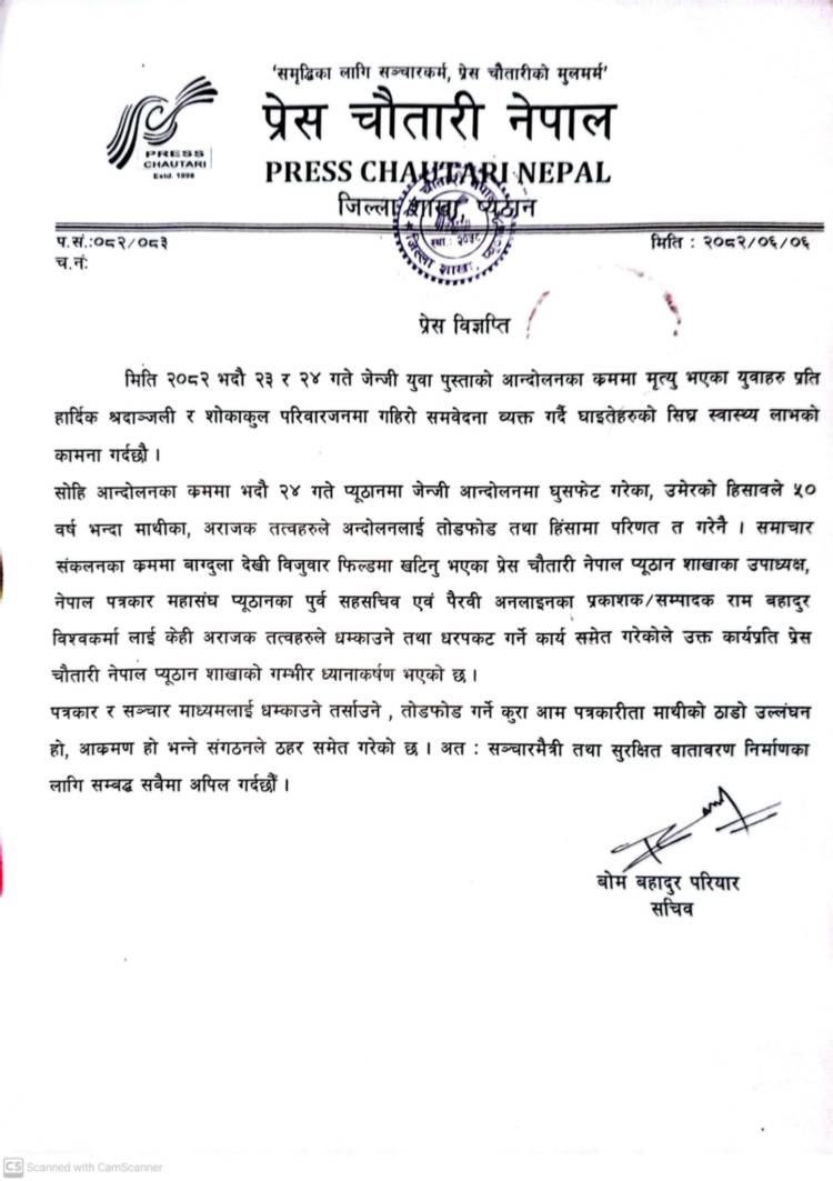 प्रेस चौतारी नेपाल,प्यूठान शाखाले पत्रकार र सञ्चार माध्यममाथिको आक्रमण सह्य नहुने स्पष्ट पार्दै,संगठनले सञ्चारमैत्री,सुरक्षित र सम्मानजनक वातावरण निर्माणका लागि सम्बन्धित सबै निकायहरूलाई तत्काल जिम्मेवारीपूर्वक पहल गर्न अपिल गरेको छ।