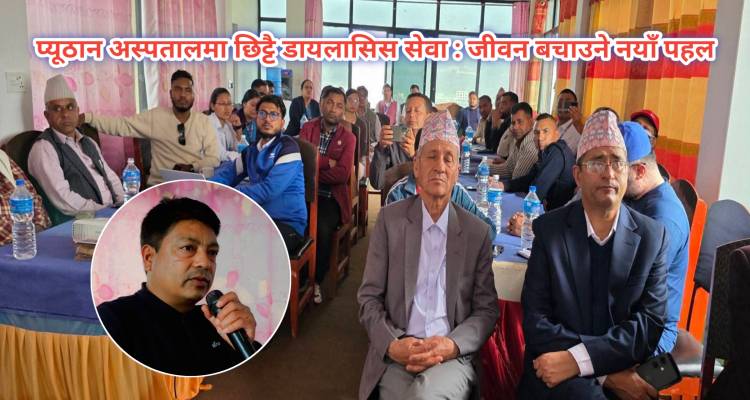 बुधबार प्यूठान अस्पतालले आयोजना गरेको सर्वपक्षीय छलफल कार्यक्रममा स्थानीय तहका प्रमुख,सरोकारवालाहरू र स्वास्थ्य विशेषज्ञहरूले डायलासिस सेवा छिट्टै सञ्चालन गर्न जोड दिएका छन्। प्यूठान अस्पतालका मेडिकल सुपरिटेन्डेन्ट डाक्टर सुवास पौडेलका अनुसार,इमर्जेन्सी बेडसहित ६ वटा बेड निर्माण भइसकेका छन् र सेवा सुरु भएसँगै बिरामीहरूलाई तत्काल सहयोग पुग्नेछ।