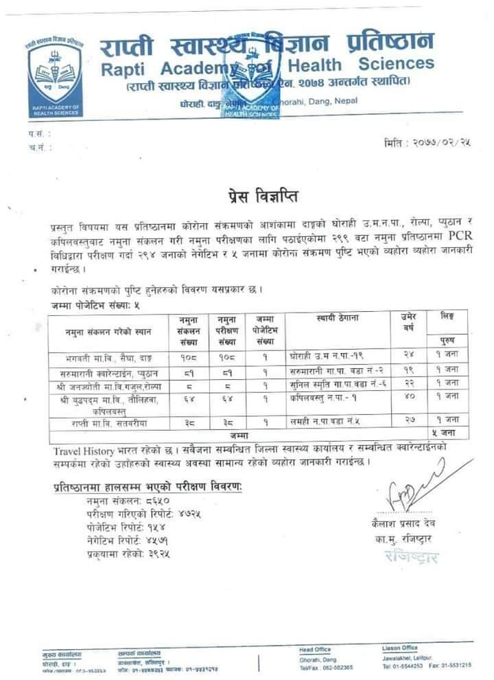 राप्ती स्वास्थ्य बिज्ञान प्रतिस्ठान दाङमा गरिएको पिसिआर परीक्षणमा प्युठानका एक युवकमा कोरोना पोजिटिभ देखिएको हो ।प्यूठानबाट ८१ जनाकाे स्वाब संकलन गरी पठाएकाेमा प्युठान सरुमारानी गाउपालिका वडा नंवर २ का एक १९ वर्षीय पुरुषमा काेराेना संक्रमण देखिएकाे र बाँकीकाे रिपाेर्ट नेगेटिभ आएकाे प्रतिष्ठानले जनाएकाे छ । स्थानिय खड्केश्वरी प्राथमिक बिध्यालयको क्वारेन्टाइनमा बसेका ती पुरुषमा कोरोना संक्रमण पुष्टि भएको हो। सोही क्वारेन्टाईनमा रहेका २७ जनाको स्वाब संकलन गरि गत जेठ १७ गते परिक्षणका लागि प्रतिष्ठान दाङ पठाईएको थियो। ती व्यक्ति यही जेठ ६ गते भारतको मध्येप्रदेशबाट स्वदेश आइपुगेको बताइएको छ । कपिलवस्तुको कृष्णनगर नाका हुँदै बीस जनाको समुहमा उनी स्वदेश आएका थिए।