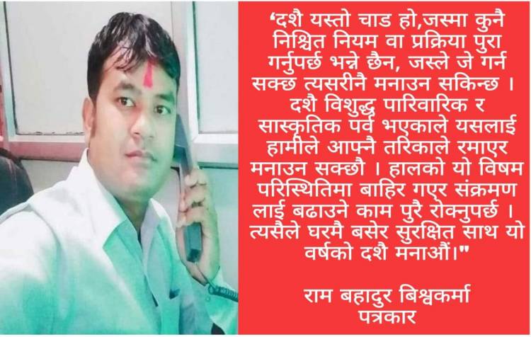 ‘दशै यस्तो चाड हो जस्मा कुनै निश्चित नियम वा प्रक्रिया पुरा गर्नुपर्छ भन्ने छैन, जस्ले जे गर्न सक्छ त्यसरीनै मनाउन सकिन्छ । यो विशुद्ध पारिवारिक र सास्कृतिक पर्व हो । यसलाई हामीले आफ्नै तरिकाले रमाएर मनाउन सक्छौ । हालको यो विषम परिस्थितिमा बाहिर गएर संक्रमण लाई बढाउने काम पुरै रोक्नुपर्छ । त्यसैले घरमै बसेर सुरक्षित साथ यो वर्षको दशै मनाऔं ।दशैंका मनोरञ्जनका लागि मात्र नभई तथा अन्य अनुत्पादक काममा प्रयोग गर्नु गलत हुन्छ । यसको सट्टा उक्त समयलाई आ-आफ्नो गाउँठाउँको कोरोना नियन्त्रण र अन्य विकासका लागि के गर्न सकिन्छ, कुन कामका लागि कसको के सहयोग जुट्न सक्छ, स्थानीय र बाह्य श्रोतलाई के कसरी परिचालन गर्न सकिन्छ भनेर छलफल चलाउने र प्रभावकारी योजना बनाउने काममा लगाउनु उपयुक्त हुन्छ ।