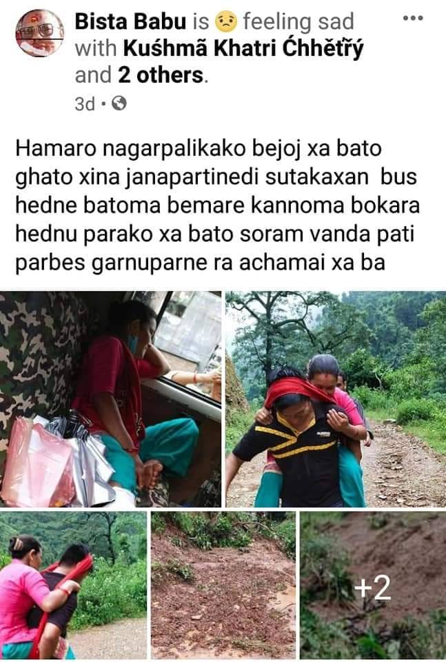 तस्बिर: ग्रामिण सडक अबरुद्ध हुँदा स्वास्थ्य समस्या भएकी गर्भवती महिलालाई स्वास्थ्य सस्थामा पुर्याउनै सकस