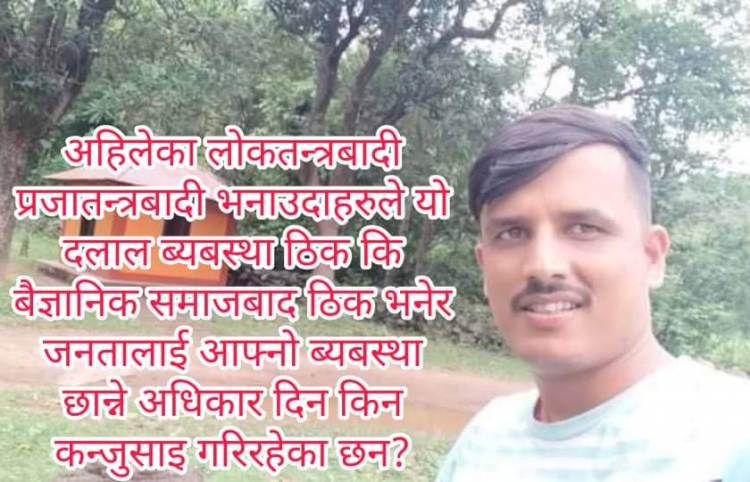 अहिलेका लोकतन्त्रबादी प्रजातन्त्रबादी भनाउदाहरुले यो दलाल ब्यबस्था ठिक कि बैज्ञानिक समाजबाद ठिक भनेर जनतालाइ आफ्नो ब्यबस्था छान्ने अधिकार दिन किन कन्जुसाई गरिरहेका छन।